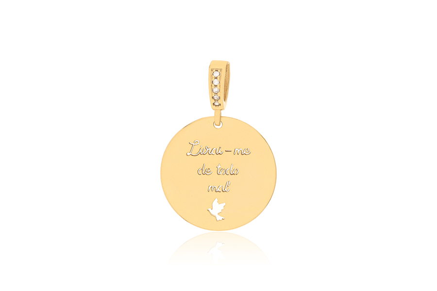 PINGENTE BANHADO EM OURO, REDONDO 23mm DIÂMETRO, LIVRAI-ME DE TODO MAL, CONTRA ARGOLA COM ZIRCÔNIAS