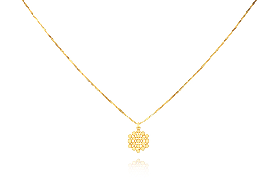 GARGANTILHA BANHADA EM OURO, NOSSA SENHORA DAS GRAÇAS, OVAL 28x23mm, 2 FLORES, ELO VENEZIANA 0,80mm, 45cm COMPRIMENTO, EXTENSOR 5cm